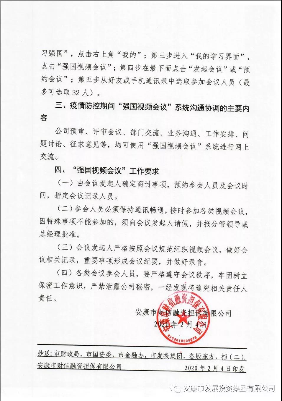 编者按:为更好履行国企社会责任、彰显国企社会担当,更好立足主业履好主责,有效贯彻落实党中央、国务院,省委省政府,市委市政府防控疫情各项决策部署,推动银发〔2020〕29号、财金〔2020〕3 号、银保监办发〔2020〕10号等文件精神在安康落地落实,积极响应中国融资担保业协会及国家融资担保基金打赢疫情防控阻击战的倡议书,足球竞彩网 作为市属国企重要一员,有责任有义务坚定不移把中省市防控疫情各项决策部署落到实处,更应主动作为、勇挑重担、创造条件、力争有为,为安康打好打赢疫情防控阻击战做出应有贡献。为确保防控疫情和服务群众两不误,最大限度减少人员流动聚集带来交叉感染,切实保护职工和办事群众生命安全和身体健康,除了迅速推出系列实际支持防控疫情政策外,还推动集团本部和各管理公司在疫情防控期间更加自觉用好用活用足学习强国APP各个职能模块,掌握疫情动态,学习防疫知识技能,鼓励各单位创新运用学习强国思路方式,这其中,市财信担保公司主动作为,印发《关于在疫情防控期间使用“强国视频会议”系统加强沟通协调推进有关工作的通知》,在防控疫情期间大胆创新运用其视频会议系统,解决了疫情期间不宜集中开会办公,更不能耽误紧急重要业务的两难问题,通过线上政银企担多方深入沟通协调,研究解决业务工作难题,实现了线上会而有议、议而有决,线下决而有行、行而有效,这些工作既提高了公司办事和服务效能,助力安康坚决打赢新型冠状病毒肺炎疫情阻击战,又在防控疫情特殊时期激发了足球竞彩网 及各管理公司创新发展能力。