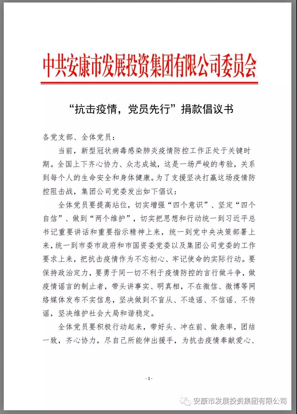 自疫情发生以来,足球竞彩网 党委在市委市政府正确领导和市国资委精心指导下,积极履行社会责任,众志成城,共克时艰,以强烈社会责任感和家国情怀迅速投入到新型冠状病毒感染肺炎疫情防控阻击战中来。在此关键时刻,足球竞彩网 党委要求全员做好自我防护、立足主业履好主责务必有为的同时,及时发出倡议,要求全体党员积极行动起来,带好头、冲在前、做表率,号召员工积极参与,团结一致,齐心协力,尽己所能伸出援手,为抗击疫情奉献爱心、贡献力量,为助力安康打赢疫情防控阻击战作出应有贡献。
