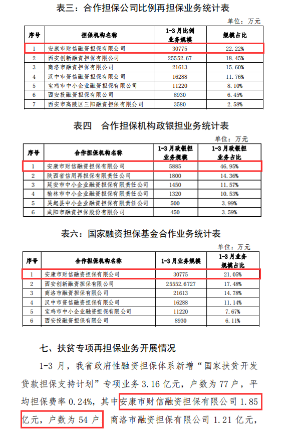 5月14日,陕西省政府性融资担保体系2020年第3期《简报》通报了2020年第一季度全省再担保业务开展情况,财信担保公司多项业务指标位居全省前列:新增融资担保业务规模103398万元,排名全省第二;比例再担保业务规模30775万元,排名全省第一;开展新型政银担银行分险业务5885万元,排名全省第一;国家融资担保基金备案合作业务30775万元,排名全省第一;开展“国家扶贫开发贷款担保支持计划”专项业务18500万元,排名全省第一。